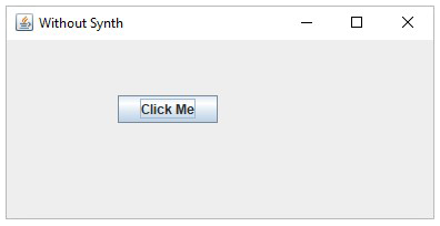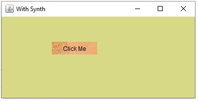 javax.swing.*; javax.swing.plaf.synth.*; class withSynth { public withSynth() { SynthLookAndFeel lookAndFeel = SynthLookAndFeel(); try { lookAndFeel.load (withSynth.class.getResourceAsStream ("buttonSkin.xml"), withSynth.class); UIManager.setLookAndFeel(lookAndFeel); } catch (Exception e) { e.printStackTrace(); } JFrame.setDefaultLookAndFeelDecorated (); JFrame frame = JFrame("With Synth"); frame.setDefaultCloseOperation (JFrame.EXIT_ON_CLOSE); frame.setLayout(); frame.setSize(400,200); JButton button = new JButton("Click Me"); button.setBounds(100,50,90,25); frame.add(button); frame.setVisible(); } public static void main(String[] args) { new withSynth(); } } 2.2. Creating buttonSkin.xml